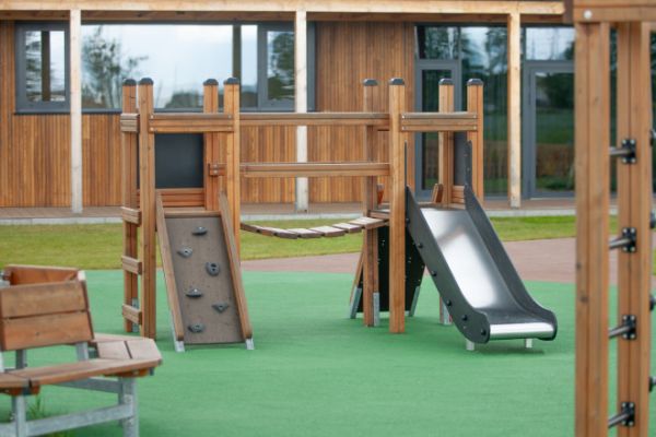 Dẫn đầu danh sách các tính năng, một cầu thang leo bằng gỗ mời gọi những nhà leo núi nhỏ khám phá. Cây cầu treo bằng gỗ thêm chút hồi hộp, đáp ứng đôi chân nhỏ bé khao khát thử thách. Ngôi nhà chơi được tô điểm với một cầu trượt thấp, chiều cao vừa đủ để kích thích mà không làm trẻ sợ hãi, khiến nó trở thành món được yêu thích đối với nhóm tuổi 3+.